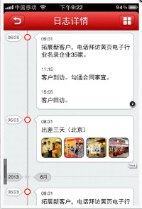 4、工作日志:支持工作日志功能,业务人员在外工作或出差时,可以直接通过移动APP输写工作日志,并可以拍取现场照。