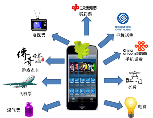 集移动充值、电信充值、联通充值、水费充值、电费充值、煤气费充值、数字电视费充值、游戏点卡Q币充值、机票购买、彩票购买一体的移动缴费平台。